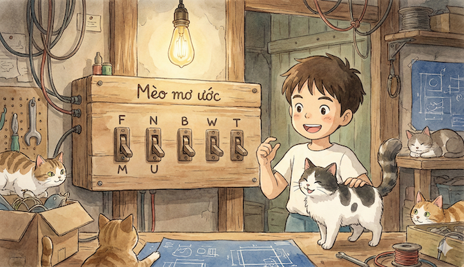 Khi F là 1, M sẽ là 0 và ngược lại. Tương tự, công tắc thứ hai đóng cho mèo đã triệt sản và mở cho chưa: