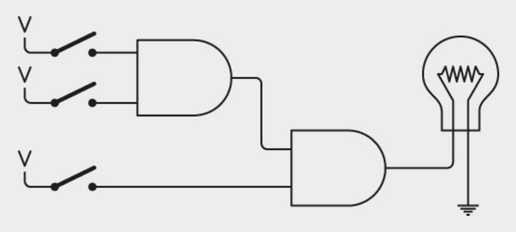 Đèn sáng khi cả ba công tắc đóng. Chỉ khi hai công tắc trên cùng đóng mới tạo ra một điện áp ở output cổng AND đầu tiên, và nếu công tắc thứ ba đóng thì output cổng AND thứ hai mới có điện áp.