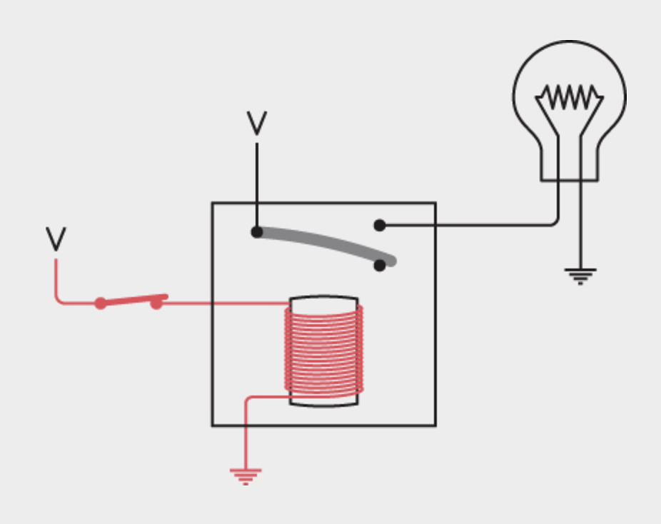 Nếu một dòng chạy qua input (ví dụ, công tắc nối input với V), nam châm điện được kích hoạt và output có điện áp.