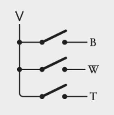 Ba công tắc khác chọn màu: đen, trắng hoặc nâu. Dưới đây là cả ba nối vào một nguồn điện: