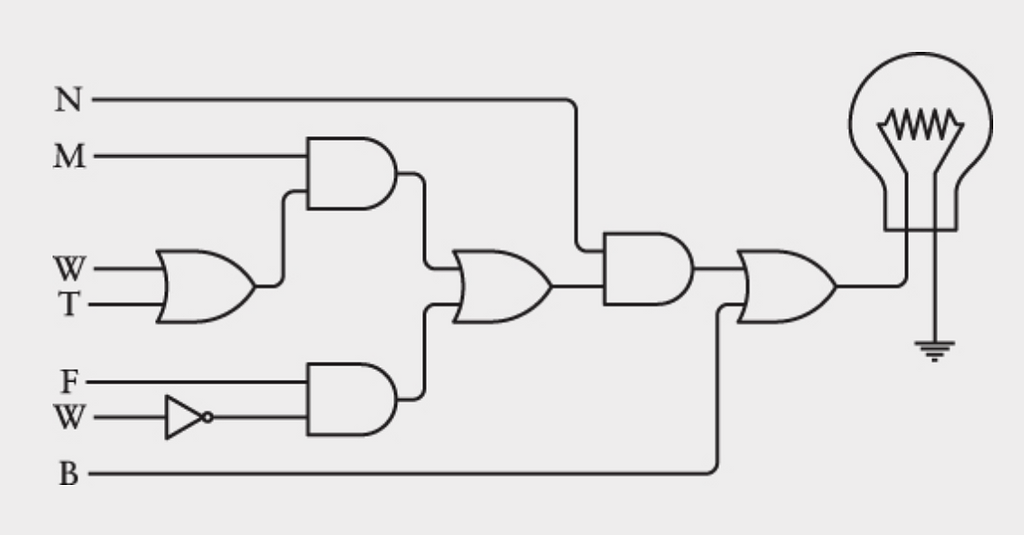 Mạch này là sự kết hợp của các công tắc, một số nối tiếp và một số nối song song. Các công tắc nối tiếp thực hiện phép toán logic AND, được biểu diễn trong biểu thức Boolean bằng ký hiệu ×. Các công tắc nối song song thực hiện phép toán logic OR tương ứng với ký hiệu +. Vì tương đương với biểu thức Boolean nên nếu biểu thức Boolean có thể được rút gọn thì mạch cũng có thể được tinh giản.