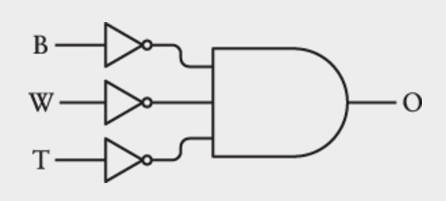 Ba input bị đảo và trở thành input cho một cổng AND. Chỉ khi cả B, W và T là 0 thì tất cả input cho cổng AND mới là 1 và tạo ra output 1.