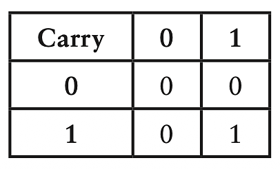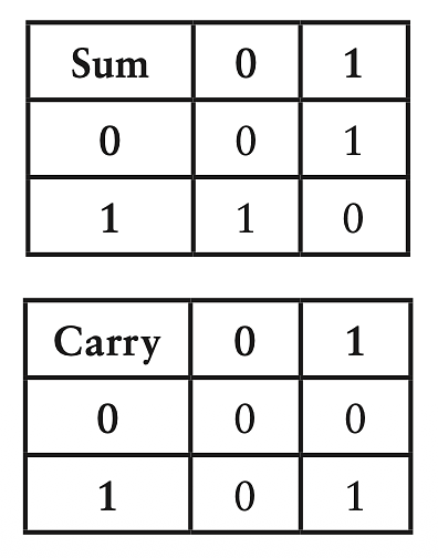 Nếu nhìn theo hướng này thì cộng một cặp số nhị phân được 2 bit, 1 cho bit tổng 1 cho bit nhớ (như trong câu "1 cộng 1 bằng 0, nhớ 1"). Giờ ta có thể chia bảng cộng nhị phân thành 2 bảng, bảng đầu cho bit tổng: