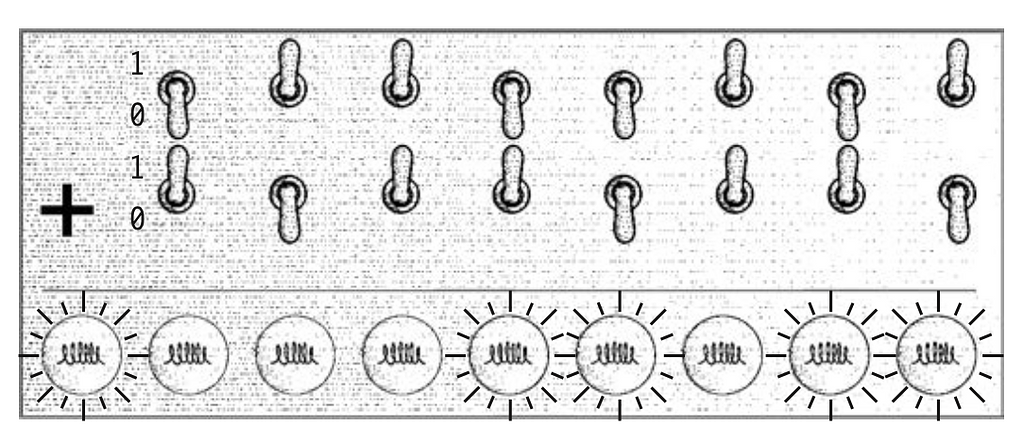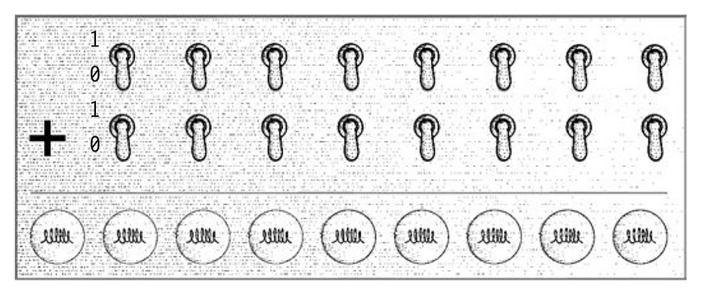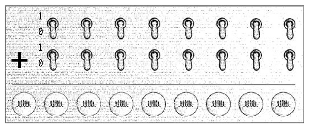 Bảng có 2 hàng 8 công tắc. Tập hợp các công tắc này được gọi là thiết bị đầu vào và ta sẽ dùng nó để "nhập vào" 2 số 8 bit. Trong thiết bị đầu vào này, công tắc tắt (xuống) cho 0 và bật (lên) cho 1, giống như công tắc tường nhà bạn. Như thường lệ, bit ít quan trọng nhất ở ngoài cùng bên phải và bit quan trọng nhất ở bên trái. Thiết bị đầu ra ở bên dưới là một hàng 9 bóng đèn. Chúng sẽ biểu thị đáp án. Bóng đèn tắt là 0, sáng là 1. Cần 9 bóng đèn là do tổng của 2 số 8 bit có thể là một số 9 bit. Bóng đèn nằm cuối cùng bên trái chỉ sáng nếu tổng lớn hơn số thập phân 255.