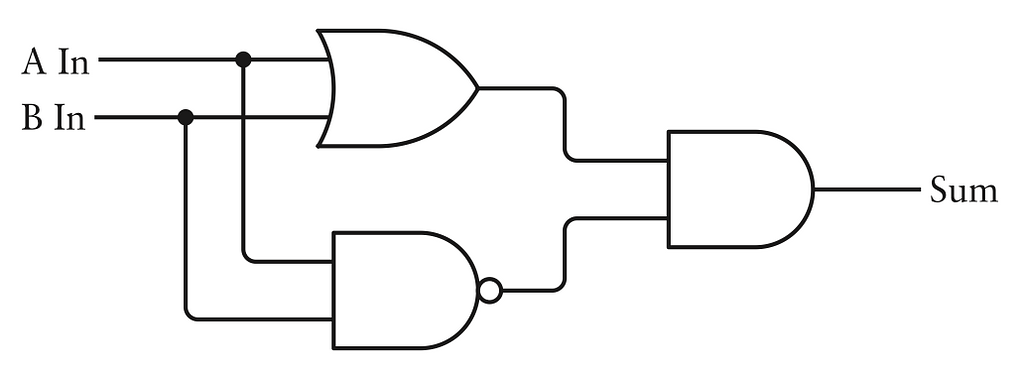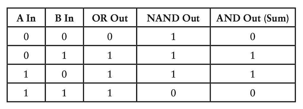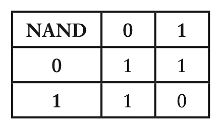 Cũng tương tự như thứ ta muốn, cổng logic NAND (hay NOT AND) có đầu ra ngược với cổng AND. Giống với tổng của 2 số 1 bit ngoại trừ trường hợp góc trên bên trái: