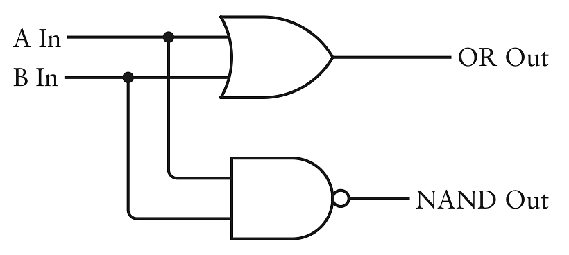 Hãy nối cả 2 cổng OR và NAND vào cùng đầu ra. Như thường lệ, chấm nhỏ thể hiện nơi dây dẫn nối với nhau còn không thì chỉ chồng lên: