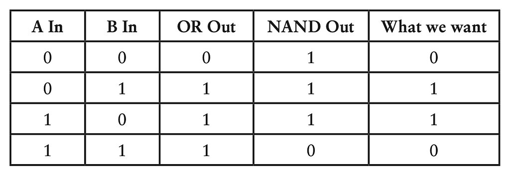 Chú ý là vẫn chỉ có 2 đầu vào và 1 đầu ra trong toàn bộ mạch này. 2 đầu vào đi vào cả cổng OR và cổng NAND. Đầu ra từ cổng OR và NAND đi vào cổng AND và điều đó cho ta chính xác thứ luôn muốn:
