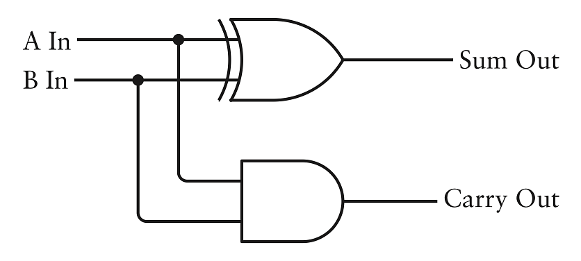 Đầu vào bên trái đặt tên là A và B cho 2 bit được đem cộng. Đầu ra bên phải là bit nhớ cho phép cộng 2 chữ số nhị phân này.
