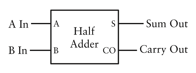 Nhãn S và CO đại diện cho Sum (Tổng) và Carry Out (Nhớ Ra). Đôi khi một hộp như này được gọi là hộp đen. Một tập hợp đầu vào cụ thể cho đầu ra tương ứng, nhưng cách thực hiện bị ẩn. Nhưng vì ta đã rành những thứ xảy ra bên trong half adder quá, thiết nghĩ nên gọi nó là hộp rõ thì đúng hơn.