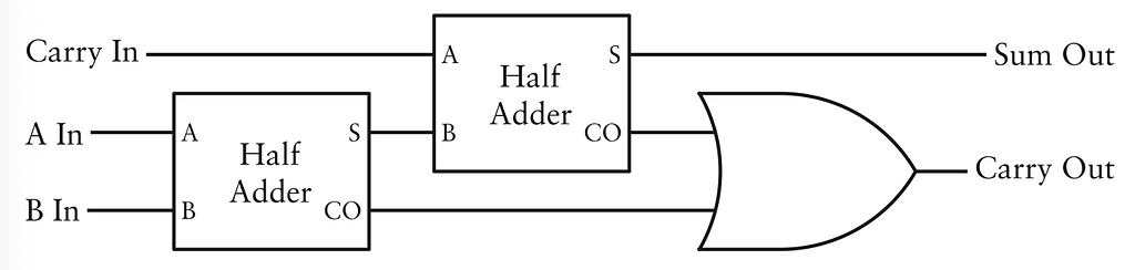 Không dễ để hình dung cách nó hoạt động. Bắt đầu với đầu vào A và B của half adder đầu tiên bên trái. Đầu ra là tổng và nhớ. Tổng phải cộng thêm nhớ từ cột trước, được gọi là Carry In (Nhớ Vào). Carry In này và Sum từ half adder đầu tiên là đầu vào cho half adder tiếp theo. Tổng của half adder thứ 2 này là tổng cuối. 2 Carry Out từ 2 half adder là đầu vào cho cổng OR. Bạn có thể nghĩ là thay bằng half adder ở đây cũng được, và chắc chắn rồi. Nhưng nếu liệt kê ra hết tất các các trường hợp bạn sẽ phát hiện ra là Carry Out từ 2 half adder không bao giờ cùng bằng 1. Cổng OR là đủ để cộng chúng vì cổng OR giống với cổng XOR nếu đầu vào không cùng bằng 1.