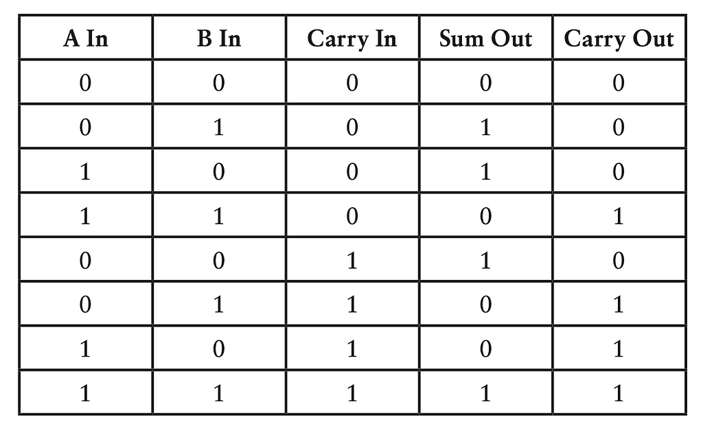 Bảng dưới tóm lại tất cả tổ hợp khả dĩ của đầu vào cho full adder và kết quả đầu ra: