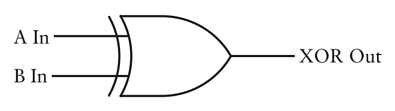 Thậm chí mạch này còn có tên nữa cơ. Nó được gọi là cổng Exclusive OR (OR loại trừ) hay ngắn gọn hơn là cổng XOR. Có người đọc nó là "eks or" (éc so) còn người khác thì đánh vần từng chữ: X O R. Nó được gọi là cổng Exclusive OR vì đầu ra là 1 chỉ khi đầu vào A là 1 hoặc đầu vào B là 1, chứ không phải cả 2. Nên thay vì phải vẽ cổng OR, cổng NAND và cổng AND như trước, ta có thể dùng kí hiệu mà thợ điện dùng cho cổng XOR: