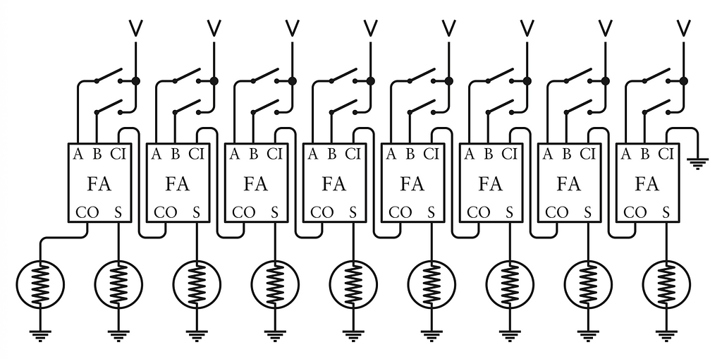 Giờ ta có thể bắt đầu nối công tắc và bóng đèn này với 8 full adder.