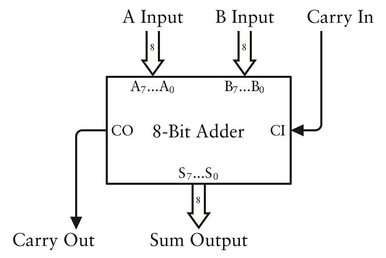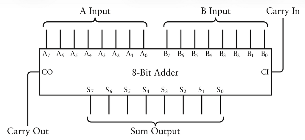 Đây là bộ cộng 8 bit hoàn chỉnh được đóng gói vào một hộp. Đầu vào gắn nhãn từ A0 tới A7 và B0 tới B7. Đầu ra từ S0 tới S7 (cho tổng):