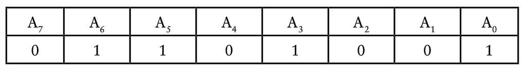 Nếu bạn nhân từng luỹ thừa 2 với chữ số bên dưới và cộng chúng lại sẽ được số thập phân tương đương 01101001, là 64 + 32 + 8 + 1 = 105.