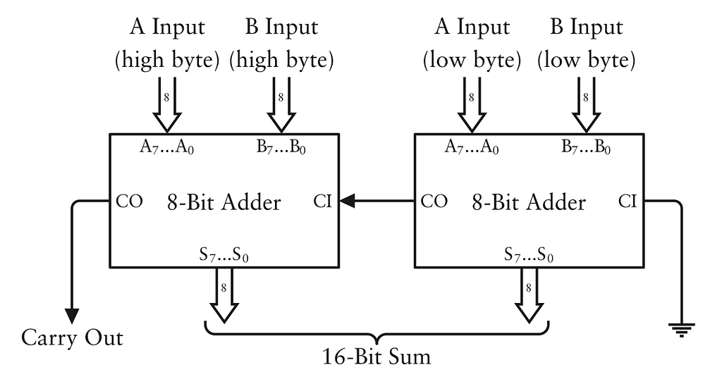 Hai giá trị đầu vào 16 bit được tách ra thành 2 byte, gọi là low byte (byte thấp) và high byte (byte cao). Carry Out của bộ cộng bên phải nối với Carry In của bộ cộng bên trái. Bộ cộng bên trái có đầu vào là 8 chữ số quan trọng nhất của 2 số đem cộng và tạo được đầu ra là 8 chữ số quan trọng nhất của kết quả.