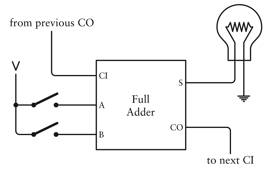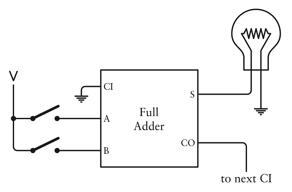 Máy cộng mà ta tạo trong chương này sẽ to, cồng kềnh, chậm chạp và ồn ào, ít nhất là khi đem so với máy tính hiện đại. Điều thú vị nhất là ta sắp tạo ra nó hoàn toàn từ các thiết bị điện đơn giản đã được học trong các chương trước - công tắc, bóng đèn, dây dẫn, pin và rơle đã được mắc sẵn thành cổng logic. Những thành phần này đều có sẵn trước thế kỉ 20. Và thật tuyệt khi ta không phải tạo ra bất kì thứ gì có thật trong phòng khách mà thay vào đó sẽ tạo máy cộng này trên giấy và trong đầu.