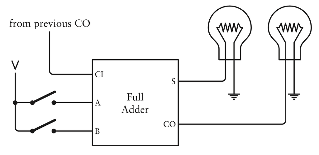 Khi bạn bắt đầu cộng 2 số nhị phân, cột số đầu tiên từ phải qua khác với phần còn lại. Là bởi mỗi cột theo sau có thể thêm một bit nhớ từ cột trước đó. Còn cột đầu tiên không có bit nhớ, đó là lí do tại sao đầu vào nhớ cho full adder được nối đất. Là 1 bit 0. Cộng cặp số nhị phân đầu tiên tất nhiên có thể được một bit nhớ. Đầu ra nhớ đó là đầu vào cho cột tiếp theo.