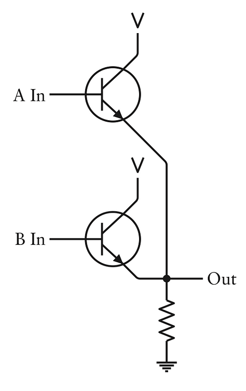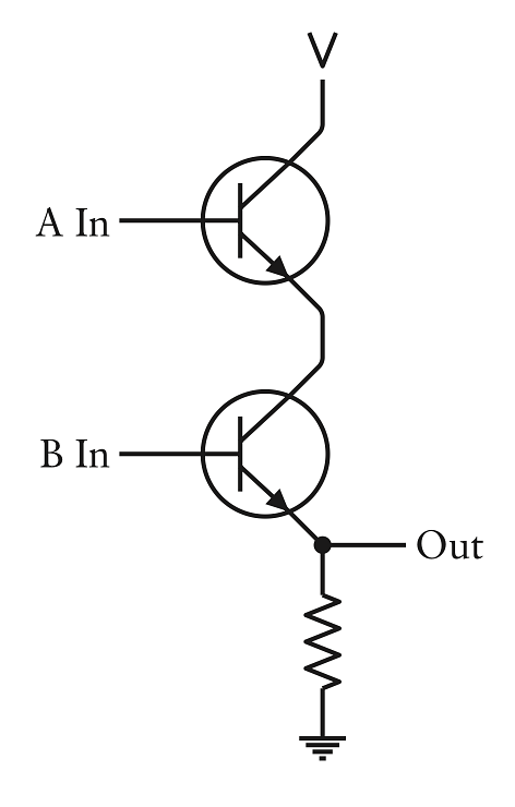 Chỉ khi cả đầu vào A và B có điện áp làm cho 2 transistor dẫn điện và do đó tạo ra một điện áp đầu ra. Điện trở ngăn đoản mạch khi nó xảy ra.
