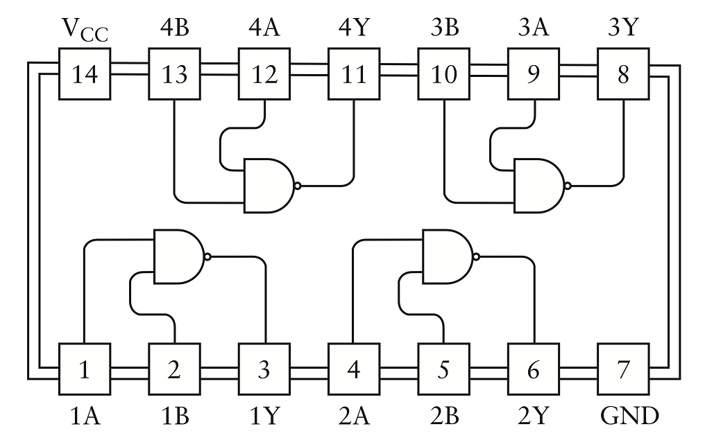 IC đầu tiên trong dãy 7400 chính là 7400, được mô tả trong Sổ Tay Dữ Liệu TTL là "Cổng NAND Dương 2 Đầu Vào Bộ Tư". Có nghĩa là vi mạch này chứa bốn cổng NAND 2 đầu vào. Chúng được gọi là cổng NAND dương vì một đầu vào 5 vôn (hoặc xấp xỉ) tương ứng với logic 1 và điện áp không tương ứng với logic 0. Đây là con chip 14 chân, và một sơ đồ nhỏ trong sổ tay dữ liệu cho thấy cách các chân tương ứng với đầu vào và đầu ra: