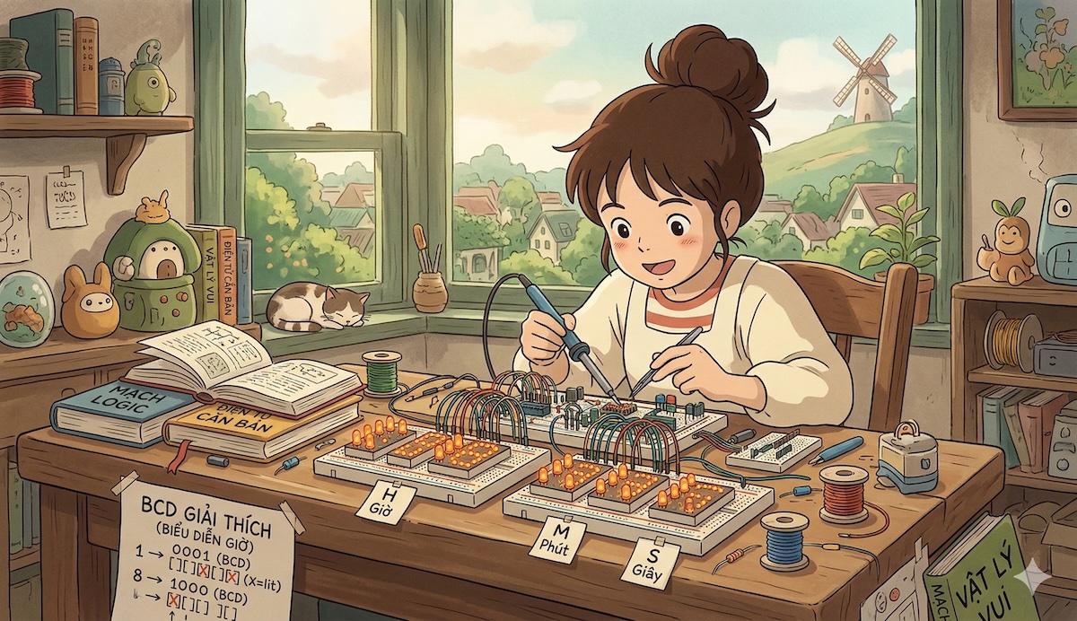 Đầu ra với chu kỳ 10 phút đó bây giờ có thể là đầu vào cho một cụm ba flip-flop khác dành cho chữ số hàng chục của phút, giống y chang chữ số hàng chục của giây: