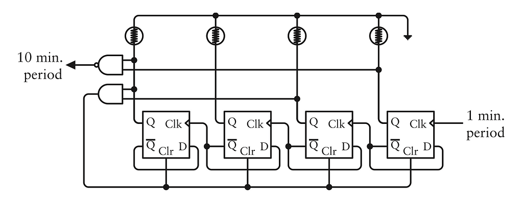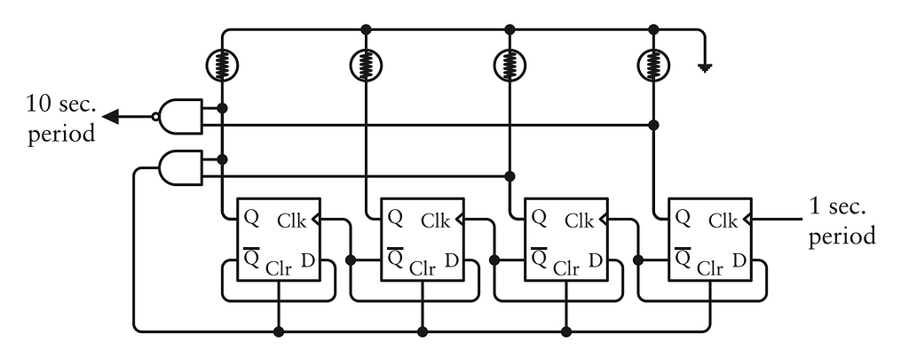 Nhớ là đầu ra của cổng NAND ngược lại với cổng AND. Bình thường đầu ra là 1, ngoại trừ khi cả hai đầu vào đều là 1 thì đầu ra sẽ là 0. Cổng NAND này được mắc sao cho hai đầu vào là 1 khi số được hiển thị là 1001 (số 9 thập phân). Đầu ra của cổng NAND sẽ trở thành 0 khi số được hiển thị là 1001 và sau đó quay lại thành 1. Điều này sẽ xảy ra cứ mỗi 10 giây một lần, và sự chuyển đổi từ 0 lên 1 đó có thể đóng vai trò làm đầu vào cho một flip-flop kích cạnh khác.