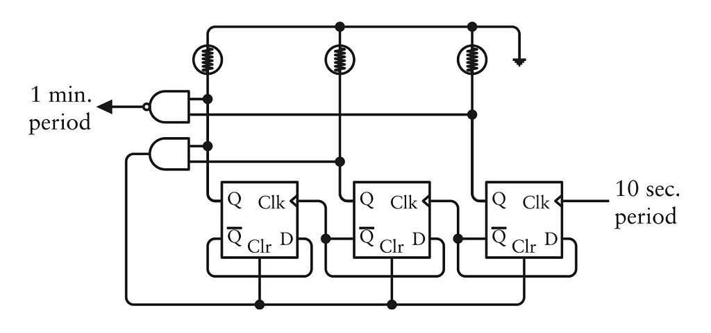 Đầu ra của cổng NAND trong mạch này trở thành 0 khi số được hiển thị là 101 (số 5 thập phân). Kết hợp với bốn flip-flop trước đó, lúc này đồng hồ đang đếm từ 000 0000 đến 101 1001 (số 59 thập phân), và tại đây tất cả bảy flip-flop quay về 0. Đây là biểu đồ định thời cho ba flip-flop này: