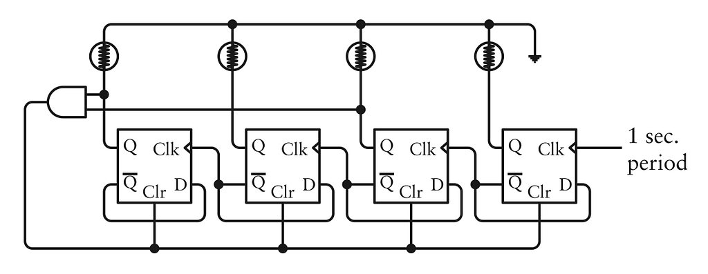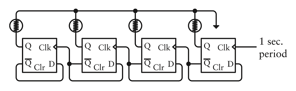 Hãy khởi động với chữ số hàng đơn vị của giây. Bạn có thể bắt đầu bằng cách nối bốn flip-flop kích cạnh theo hàng, tương tự như cách các flip-flop được mắc ở Chương 17 để tạo ra một bộ đếm sóng (ripple counter). Mỗi đầu ra Q của các flip-flop được nối với một bóng đèn: