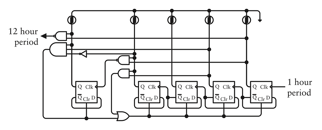 Mạch này hiển thị thành công số giờ theo trình tự từ 0 đến 11. Giờ thì chúng ta chỉ cần sửa một vấn đề: Khi tất cả đầu ra Q của các flip-flop đều là 0, chúng ta muốn số giờ phải là 12, tức là 1 0010.
