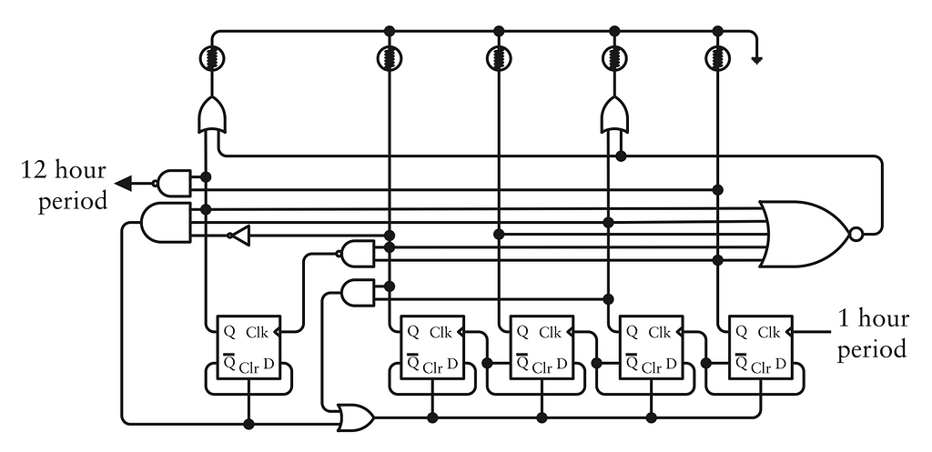 Nhưng một cổng AND ba-đầu-vào khác ở tít bên trái phía trên sẽ xác định khi chữ số hàng chục của giờ là 1 và các chữ số hàng đơn vị là 0010 (số 2 thập phân), tạo ra một giá trị BCD kết hợp là 12. Bạn có thể nghĩ rằng mình muốn hiển thị số 12 lúc này, nhưng rồi bạn sẽ bị kẹt với việc làm sao hiển thị giá trị tiếp theo là 1. Thay vào đó, cổng AND ba-đầu-vào này xóa sạch cả năm flip-flop để số giờ hiển thị là 0.