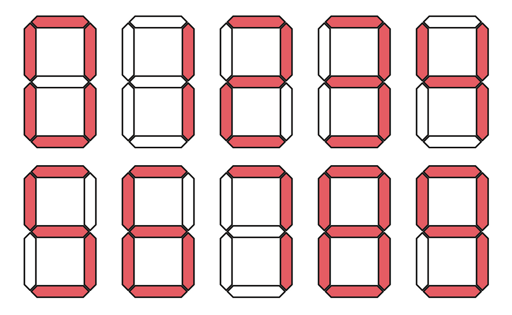 Một cách tiếp cận phổ biến hơn để hiển thị các số thập phân là màn hình bảy-thanh (seven-segment display). Màn hình này bao gồm bảy dải đèn thuôn dài được xếp thành một mẫu hình đơn giản: