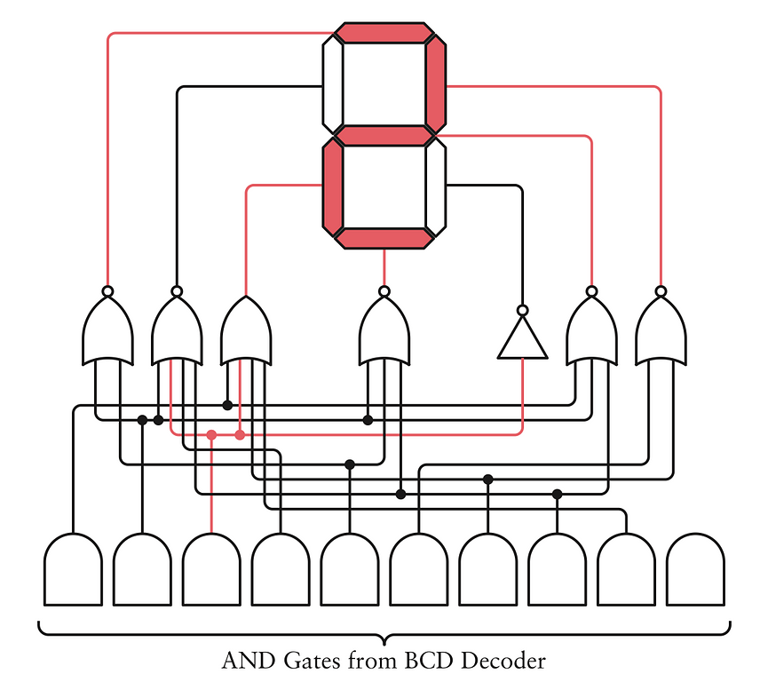 Tôi biết mạch này nhìn ghê thật, nhưng nó lại siêu hệ thống đấy. Số BCD đến từ bốn flip-flop nằm ở phía dưới. Các sợi dây màu đỏ trong hình biểu thị rằng số này hiện tại đang là 0101, tức số nhị phân của số 5. Mỗi một tín hiệu trong bốn tín hiệu đó sẽ được đảo ngược lại bằng bộ đảo (inverter), và các tổ hợp khác nhau của những tín hiệu gốc và tín hiệu đã bị đảo này đều đi vào mười cổng AND bốn-đầu-vào. Đối với cổng AND tương ứng với số 5 — cổng AND nằm ngay bên phải của trung tâm — bốn đầu vào là: