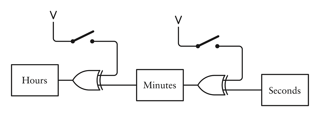 Giây, giờ và phút của đồng hồ nhị phân được nối từ phải sang trái, như trong sơ đồ khối sau: