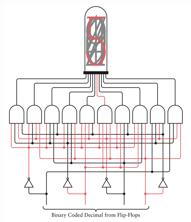 Mạch điện tử của một ống Nixie phải chuyển đổi các số thập phân được mã hóa nhị phân từ các flip-flop thành các tín hiệu riêng biệt cho mỗi một trong mười chân cắm. Khi con số là 0000, bạn cần một tín hiệu cho chân cắm đầu tiên đại diện cho số 0. Khi con số là 0001, đó sẽ là chân cắm cho số 1, và khi con số là 1001, đó là chân cắm cuối cùng cho số 9.