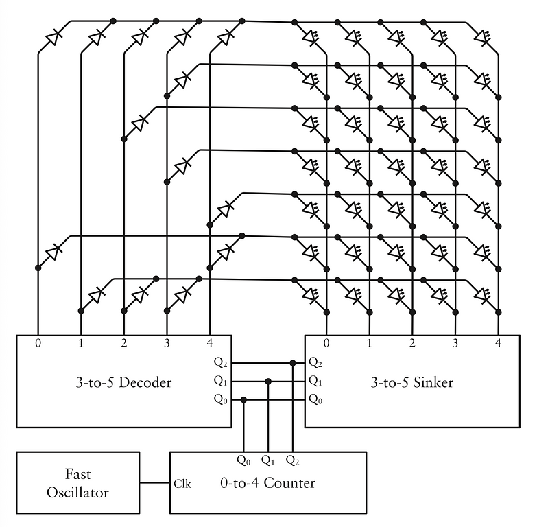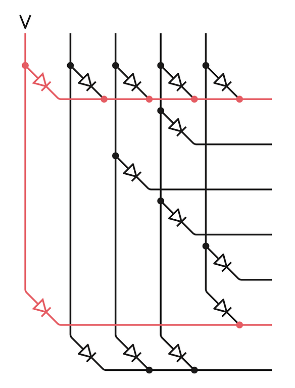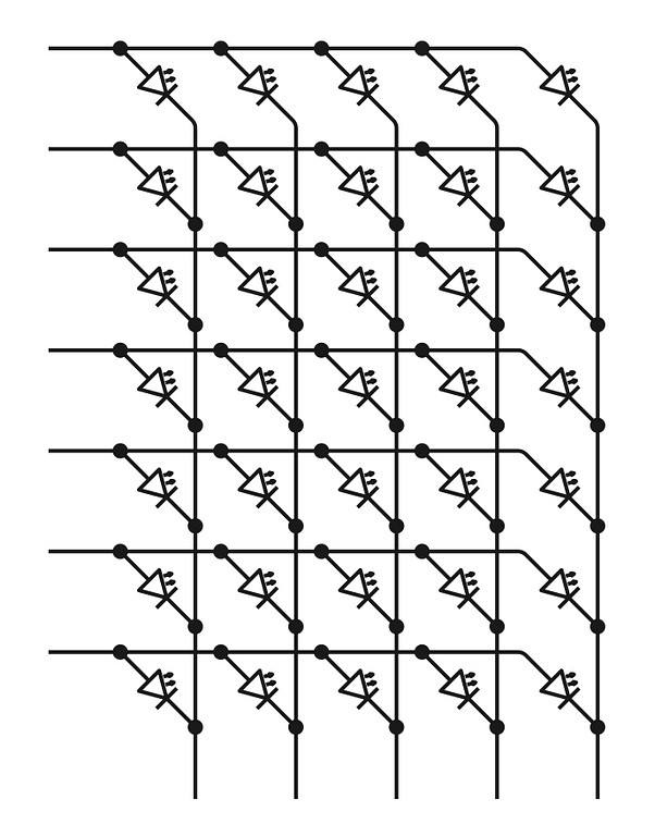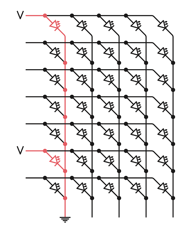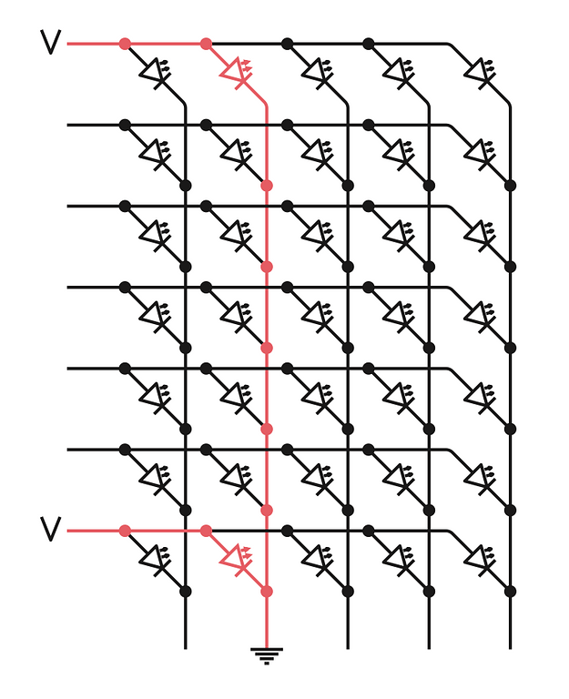 Mỗi đèn LED nằm ở một điểm giao giữa một hàng và một cột. Trong mỗi hàng của các đèn LED, các đầu vào của diode được nối với nhau, và trong mỗi cột, các đầu ra được nối lại. (Một sơ đồ thay thế là đầu vào kết nối theo cột còn đầu ra theo hàng, nhưng nhìn chung thì chẳng có khác biệt đáng kể nào trong cách nó hoạt động cả.)