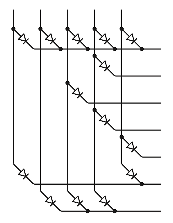 Sơ đồ sau đây cho thấy ma trận diode ROM và màn hình hiển thị ma trận điểm được nối dây với nhau thông qua một số mạch phụ trợ. Ma trận diode ROM đã được xoay lại một chút so với hình bạn vừa thấy, nhưng về chức năng thì nó hoàn toàn như nhau: