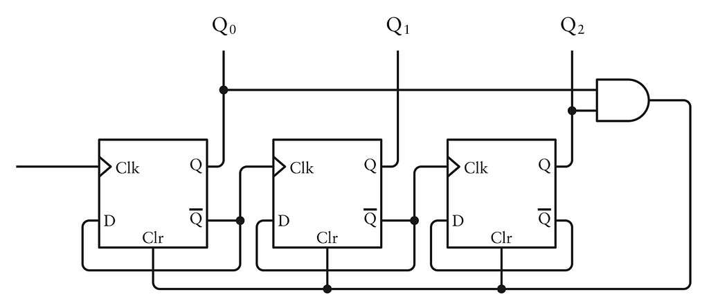 Việc này có thể được hoàn thành bằng một cổng AND nối với hai trong số các đầu ra Q của flip-flop: