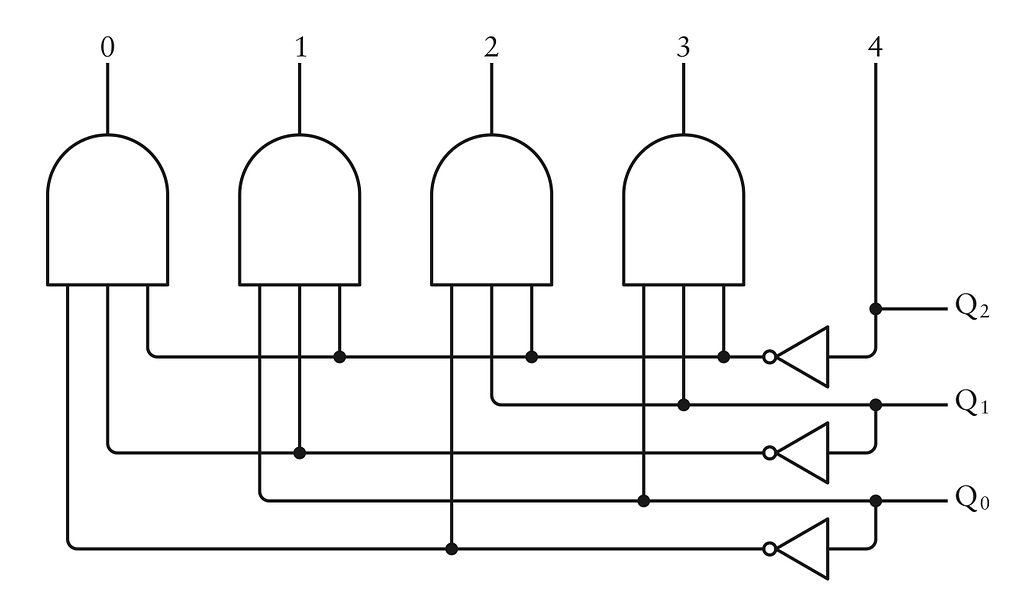 Khi số nhị phân ba chữ số đếm từ 000 đến 100, các đầu ra của bộ giải mã sẽ lần lượt là 0, 1, 2, 3, 4, và sau đó quay lại 0 cho chu kỳ tiếp theo. Lưu ý rằng đầu ra được dán nhãn "4" không yêu cầu một cổng AND, bởi vì Q2 bằng 1 chỉ khi số nhị phân là 100, tức là số 4.