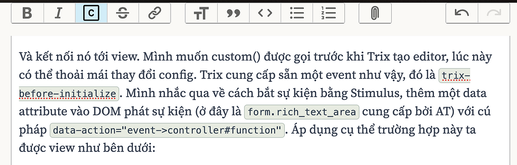 Mình viết blog này bằng Rails nên dùng luôn trình soạn thảo mặc định của nó là Action Text (AT) để viết bài. AT tới lượt nó lại dùng Trix, editor viết bằng JavaScript (JS) cây nhà lá vườn của công ty 37signals. Thanh toolbar mặc định gồm những nút chức năng như sau: